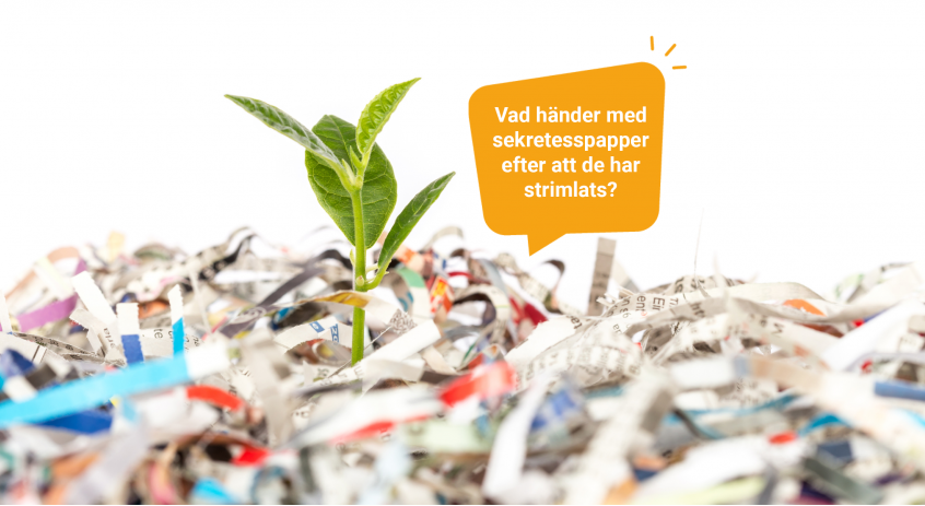 Svar: När sekretesspapper skickas till destruktion (systematisk och medveten förstörelse) så kommer det pappersavfall som bildats efter strimling att gå till materialåtervinning. Det betyder att man använder samma material för att göra nytt material, i detta fall nytt papper. Cirkulärt!